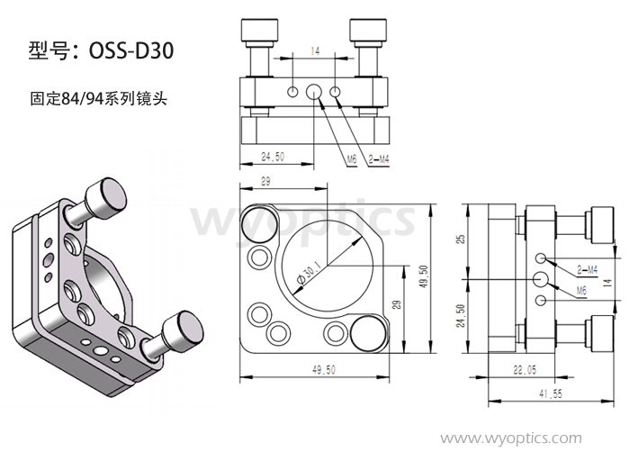 OSS-D30调整镜架主要针对我司的84系列和94系列准直镜设计的一款调整镜架,可以安装直径为30mm的原型体,侧面有两个顶丝固定;可以安装在光学支杆上。
