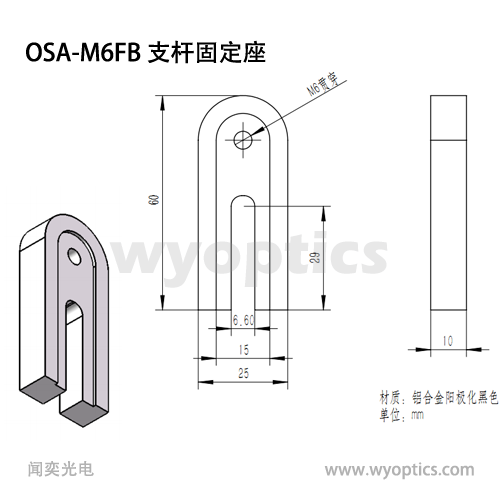 OSA-M6FB 底座 可用于OSB和OSA-10支杆的固定用途,一般光学平板的螺孔是25mm间距,为了调节到不同位置,就得增加OSA-M6FB 底座(本产品包含一颗M6 x 18的内六角螺钉,可以方便固定在M6的光学平板或者带有M6螺孔的板上)。